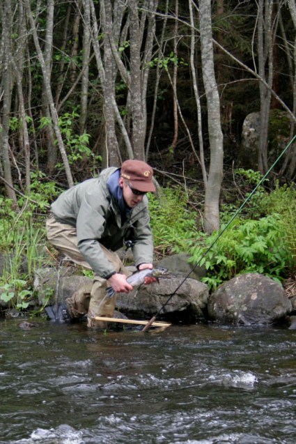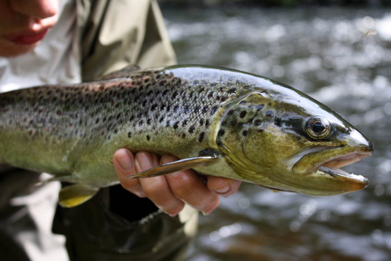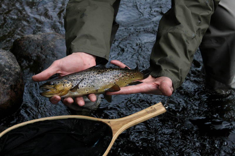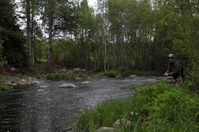 Runsaiden tapahtumien jälkeen olimme tarmoa täynnä ja suuntasimme laavusta ylöspäin. Nämä vedet olivat taas täynnä 20-30cm taimenta ja niitä saikin irrotella striimeristä vähän väliä. Kyllä Jyri onnistui löytämään montusta yhden mittakalankin. Loppupäivä menikin jokea ylos-alas tarpoessa, mutta kaikki tapahtumat sattuivat laavun ja järven välisellä osuudella. Joki tarjosi meille loppupäivästä vielä haaviin asti 44cm istukkaan ja mitallisen luonnonkalan. Päivänsana reissulla oli musta striimeri.