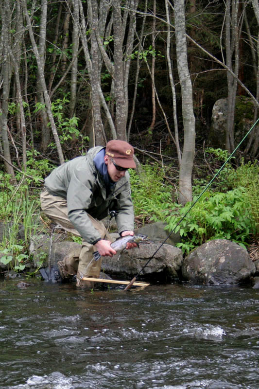 Omalla kohdalla hienointa oli se, että pääsi koittamaan vihdoin ja viimein uutta, perhomessupäivänä Sportiasta ostamaani #5 settiä. Tähän asti olin pärjännyt melkein koko perhokalastusurani, eli noin 7v, jollain Visionin Intro -setillä (130e, Prisma), joten odotukset olivat suuret. Uusi setti koostui Visionin GT Four -vavasta (9kinttune), Loopin Multi -kelasta ja kelalle ostin vielä Visionin Nite –siiman. Olihan se ero edelliseen aika huomattava. Tuntui että heittoihin tuli paljon enemmän tarkkuutta ja siima juoksi renkaissa kuin unelma. Ainut mikä jäi reissun päätteeksi harmittamaan oli kun reissun viimeisellä tunnilla riuhtoessani perhoa kivestä irti, monofiili olikin kietoutunut heittosiiman päässä olevan ”integroidun” loopin ympärille ja repi sen siitä kohtaa ydintä myöten poikki. Noh, täytyy leikkaa se kärki ja heittää siihen sellanen Visionin perus ”irto” looppi. En ollut muutenkaan ihan varma siitä heittosiiman valmiista loopista. Sai siiman kärjen jotenkin jäykäksi.