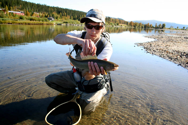 Noh, illalla kumottiin taas muutama idea kurkusta ja seuraavana päivänä päätettiin palata Tjulånille, mutta tällä kertaa menisimme aivan alaosille. Täällä vettä näytti olevan ja odotukset alkoivat pikkuhiljaa kipuamaan takaisin. Puolen päivän tyhjän heittämisen jälkeen olivat odotukset jälleen karvan varassa kunnes huomasimme harjuksia sillan yläpuolella olevassa montussa. Kalat näkyivät aivan selkeästi ja pystyimme laskemaan reilu 15 harjusta jotka olivat välillä 30-50cm. Voi sanoa että sillalla vallitsi 5 min hiljaisuus kun tuijoteltiin suut montulla alaspäin. Nämä kalat olivat niin häiriintyneitä etteivät ottaneet enää mihinkään mutta toiveet kalasta nousivat taas!! Jätimme tämän montun rauhaan ja suuntasimme jokea ylöspäin. Taaskin saalis uupui kun ronklasimme jokea alaspäin, puolet rasioiden ”harjus”perhoista oli uitettu ilman tulosta. Lähdimme tarpomaan jokea alaspäin lounaan toiveessa kunnes jyssellä napsahti selässä jotain suonia poikki ja jouduimme pysähtymään kun se jäi kitumaan joen penkalle. Samassa kuului joesta ”plomps” –se ääni mitä ollaan etsitty koko alkuviikko. Pinturi töihin ja samantien oli tuhti harjus kiinni. Lounaat myöhemmälle ja pinturia veteen! Onnistuimme saamaan reilun puolentunnin sisään kuus nättiä harjusta samoilta jalansijoilta mitoiltaan 35-40+ cm. Näitä olisi voinut vedellä samasta paikasta niin paljon kuin olisi vaan halunnut. Maha kurnui kuitenkin siihen malliin että oli pakko mennä syömään. Peli oli kuitenkin nyt auki ja pallit pois padasta vihdoin! Kalamiehillä oli hymy herkässä. Illalla menimme samaa jokea alaspäin ja iltahämärissä onnistuimme rantauttamaan muutamia samaa kaliiberia olevia pinturiharreja. Jokunen isompikin rohmu kävi välillä sekoittamassa joen pintaa mutta ne olivat meitä fiksumpia.