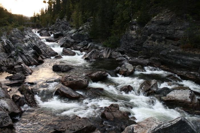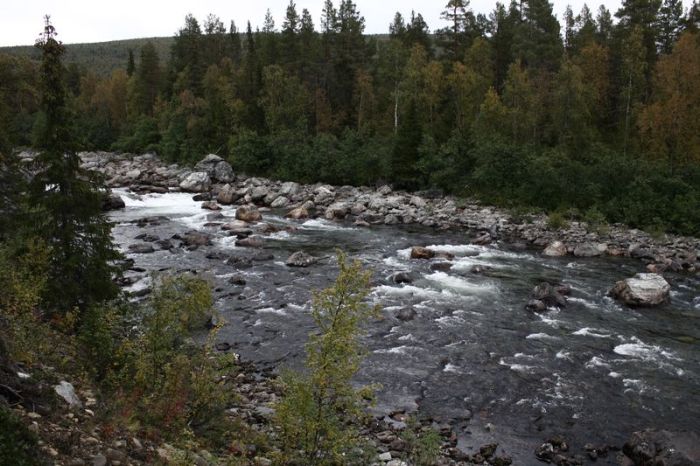 Aamu näytti ikkunasta aika samanlaiselta kuin tulopäiväkin, pilvistä mutta tuuletonta. Tämähän sopi mainiosti. Kävimme jo edellisenä iltana hakemassa yleisluvan (public license) alueelle. Tämä kattoi aika laajasti vettä Ammarnäsin alueella. Meitä kiinnosti lähinnä Vindelån ja Tjulån. Hirven metsästys typisti hieman kalastusaluetta jokien yläpäästä. Lisäksi Sjöforsen on tässävaiheessa jo ”erikoisaluetta” johon toivoimme saavamme luvat myöhemmin. Ensimmäisen kalastus päivän ajattelimme käyttää harjusten tykittämiseen. Mukaan siis kevyemmät setit ja suunta Tjulån –joelle, joka on brändätty suurharjus joeksi. Kun saavuimme rantaan ensimmäinen ajatus päässä oli, että missä on kaikki vesi!?! Joki oli aivan kuiva! Kalastimme jokea pitkästi alaspäin, mutta se näytti kaikki samalta. Ensimmäinen päivä meni kuivaa joenpenkkaa tarpoessa ylös-alas. Ei kalan kalaa! Meitä varoitettiin matalasta vedestä, mutta ei me nyt ihan tätä odotettu.. Pettymys nro 1..