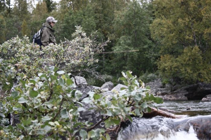 Nojoo, vielä jaksettiin pysyä positiivisena ja usko siirrettiin toiselle joelle, Vindelåniin. Tämä oli taas ”tunnettu” paikallisesta taimenesta. ”A LOT of small brown trout” –sanoin luvanmyyjä ja haroi käsillään 30-50cm väliä. Nojoo, jospa nyt kokeiltaisiin tätä! Seuraavana päivä varattiin siis Vindelånin haravointiin. Vesi oli täälläkin todella matalalla ja todella kirkasta. Lisäksi aurinko porotti nyt kirkkaalta taivaalta ja päivällä lämpöä oli n.17 astetta. Pommitettiin koko päivä jokea ylhäältä alas, havaitsematta yhtäkään edes lähellä mitallista olevaa kalaa. Saimme tosin runsaasti 20-30 taimenen penikoita. Tosiaan ”Small brownies”!