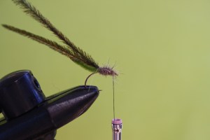 3. Kiinnitä chenillen kiinnityskohtaan pari kappaletta riikinkukon silmähöyhenen siikasia.