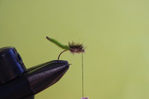 2. Sido noin 1-1,5 cm mittainen pätkä chenilleä peräksi ja kärtsää sytkärillä muotoon. (Huom! Chenille palaa kuin sytytyslanka, joten ole varovainen ettet sulata liian lyhyeksi).