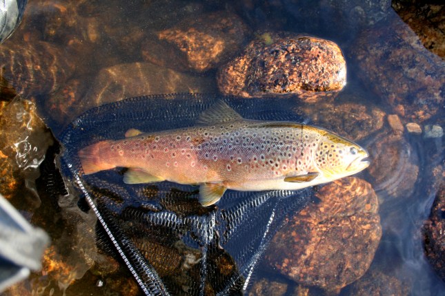 Lounaan aikana taivaalle oli alkanut kerääntyä tummia pilviä ja taisi ukkonenkin hieman jyrähdellä ja kohta satoikin ihan kunnolla. Tästä huolimatta palasimme joelle, jossa näkyi taas harvakseltaan pintakäyntejä. Jyri paineli alemmas, jossa aiemmin päivällä oli käynyt pinturissa hieman paremman kokoinen kala. Muut kiersivät saman tien ylös aina niskalle asti. Ilta oli jo kääntynyt yöksi ja sadekin lakannut. Kalojen pintakäynnit olivat muuttuneet tuikeista aggressiivisiksi pyörähdyksiksi ja pari isompaa kalaa möyrysi pinnassa pikkukalojen perässä. Tinseliä siiman jatkeeksi ja kohta Leo väsyttelikin rantaan upealla värityksellä varustetun 45cm taimenen. Pari kalaa oli aiemminkin käynyt perhoa maistamassa. Jyri tuli myös alhaalta parin iltapalaksi antautuneen harjuksen kanssa ja suuntasi saman tien niskalle. Leolla oli ollut niskalla tapahtumia tinseliin, joten tinseli päätyi myös Jyrin siiman päähän. Muutama heitto niskalla ja kohta tätäkin tinseliä vietiin aivan pinnan tuntumasta. Vietiin sitten kerralla perukkeineen päivineen. Damn! Oli ilmeisesti johonkin päässyt hankaamaan kun katkesi tyvestä yllättävän helposti. Älkää siis olko yhtä laiskoja ja tarkastakaa perukkeen kunto tarpeeksi usein! Tälle yölle ei sitten kummempia tapahtumia tullutkaan ja aamun sarastaessa suuntasimme taas leiriin syömään ja nukkumaan.