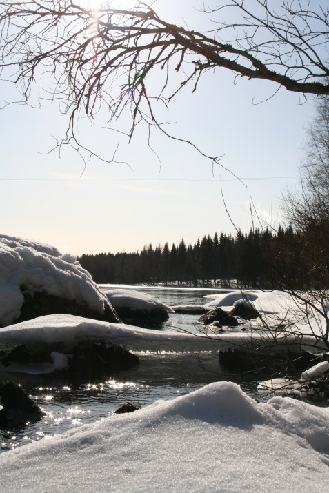 Aamupäivä heitettiin tyhjää ja valuttiin hissukseen alaspäin. Autolle tultaessa pikaiset eväät naamaan ja lähdettiin tarpomaan kohti Alasuvantoa, josta Janne olikin jo noussut pois ja mutusteli vuorostaan omia eväitä. Alasuvanto näytti juuri sellaiselta paikalta, missä kalan kuvittelisikin olevan siihen aikaan vuodesta. Eipä siinä kauaa mennytkään, kun sain käytettyä haavissa nätin 53 senttisen. Kala oli laiha talven jäljiltä ja päätyikin haavin pohjalle aika nopeasti. Komea otus kuitenkin!