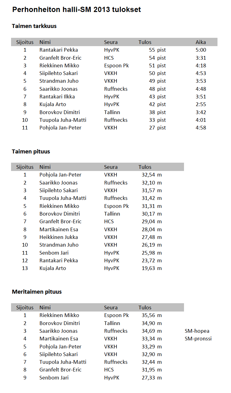 Lajeina oli taimentarkkuus, taimenpituus ja meritaimenpituus. Halliolosuhteet tarjosivat täydelliset, täysin tuulettomat olosuhteet heittämiseen. Taimen tarkkuuden taso oli huikea ja moni heitti lähelle tai yli 50 pistettä. Pituusheittolajien taso sen sijaan oli onnettoman surkea, vaikka ennen kisaa ja kisan jälkeen nähtiin useita metrejä pidempiä heittoja.