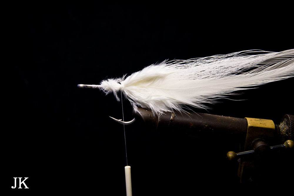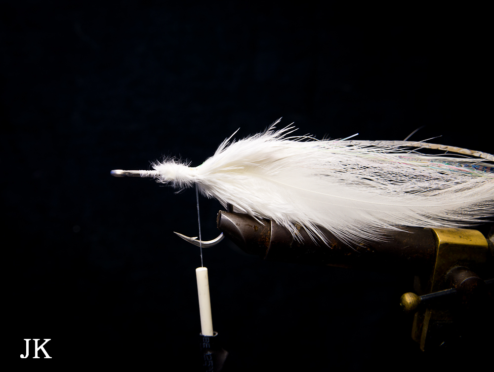 Pyrstö – Valkoinen bucktail ja 4kpl valkoisia kukon häkilähöyheniä + hopeista fläsää.