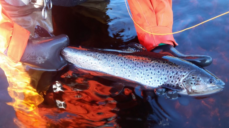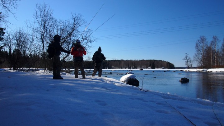 Lauantaiaamuna paistoi aurinko kirkkaalta taivaalta ja kun saimme saunassa kuivumassa olleet kahluukengät irti jäisestä lattiasta, suuntasimme joelle. Keskitimme kalastuksen aikalailla niskalle, koska siellä tuntui eniten elämää olevan. Aina vähän väliä tuikki paljasti nousevan kalan ja perhomiehen kädet alkoivat tutisemaan.