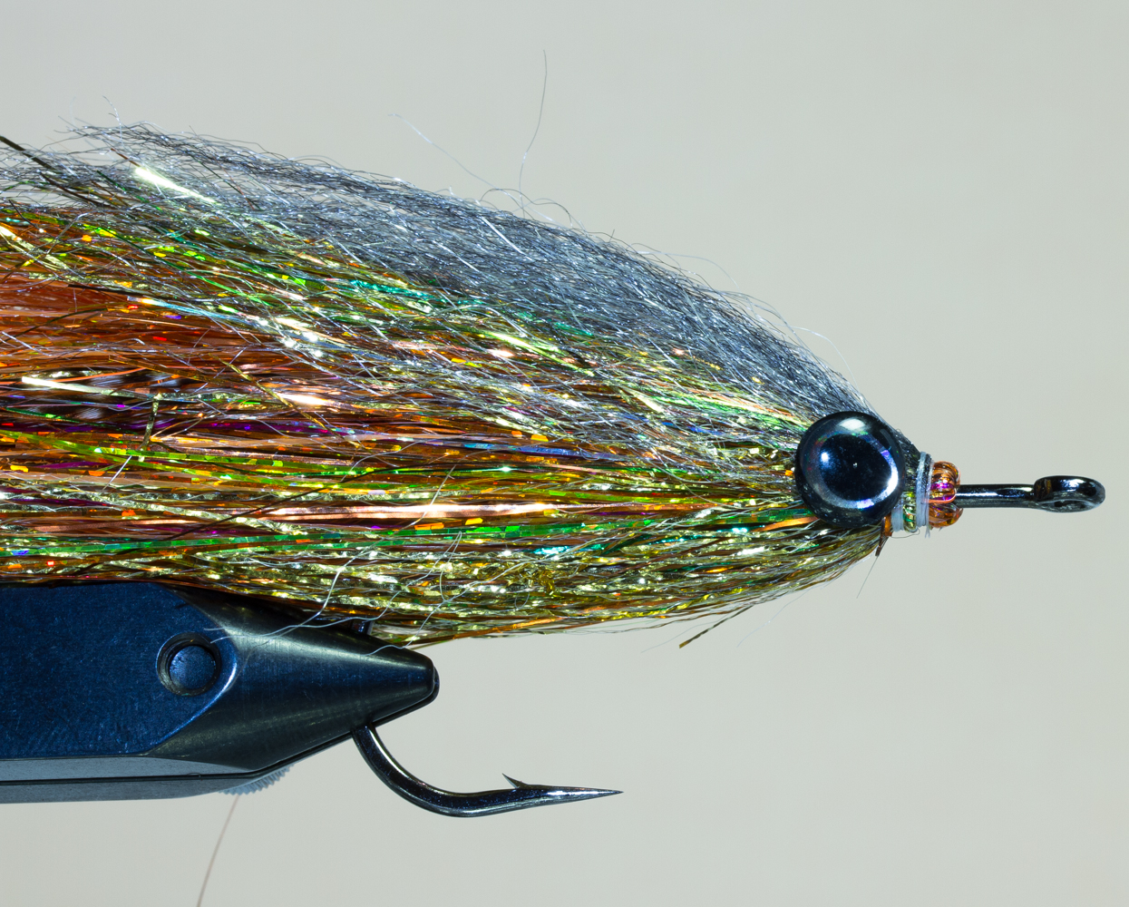Pyrstöön lisään aina muutaman Lateral Scale -kimalteen. Vaikka tähän perhoon tulee todella paljon kimalletta tinselin muodossa, niin muutama leveä Lateral Scale on aina paikallaan.