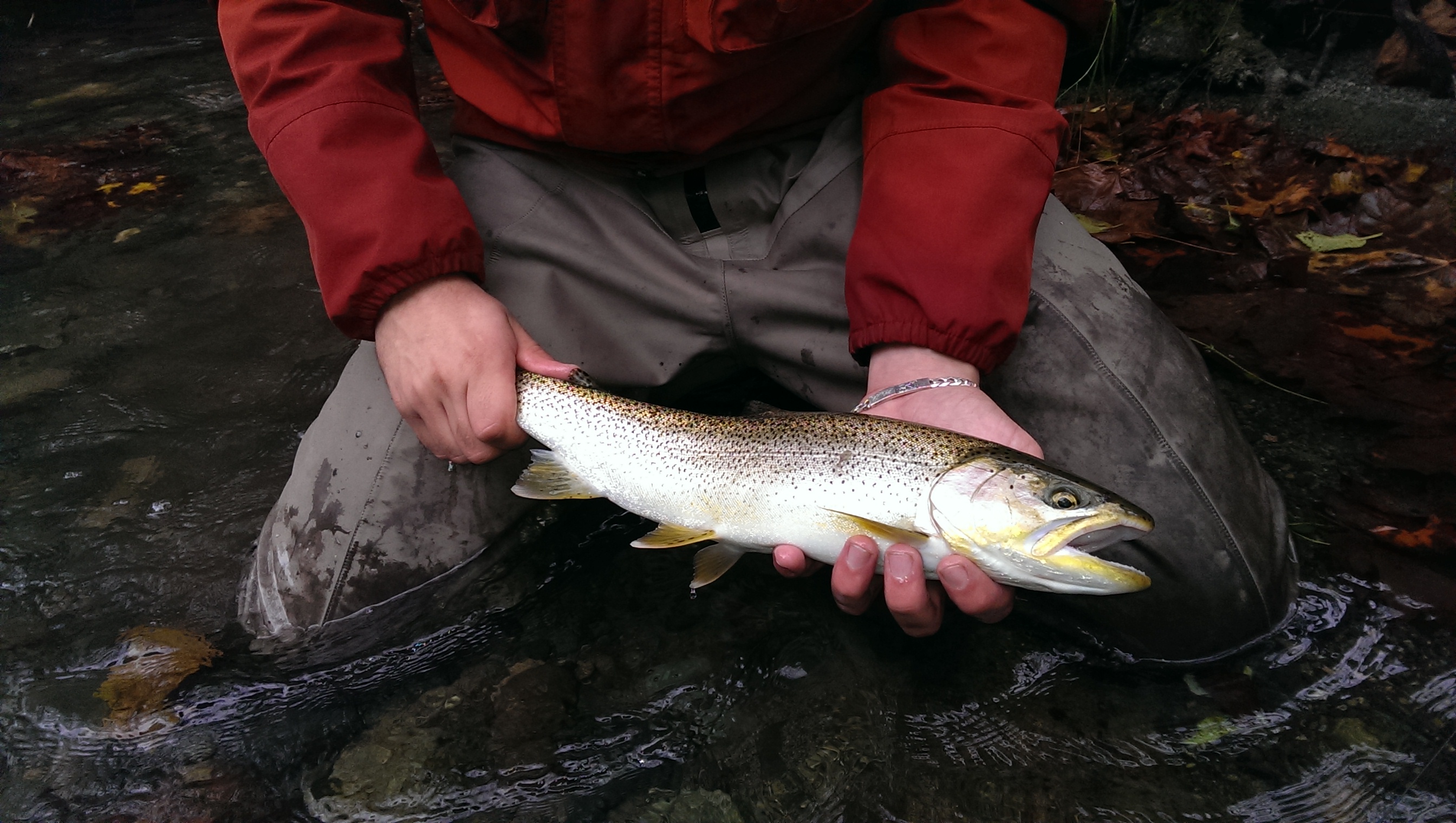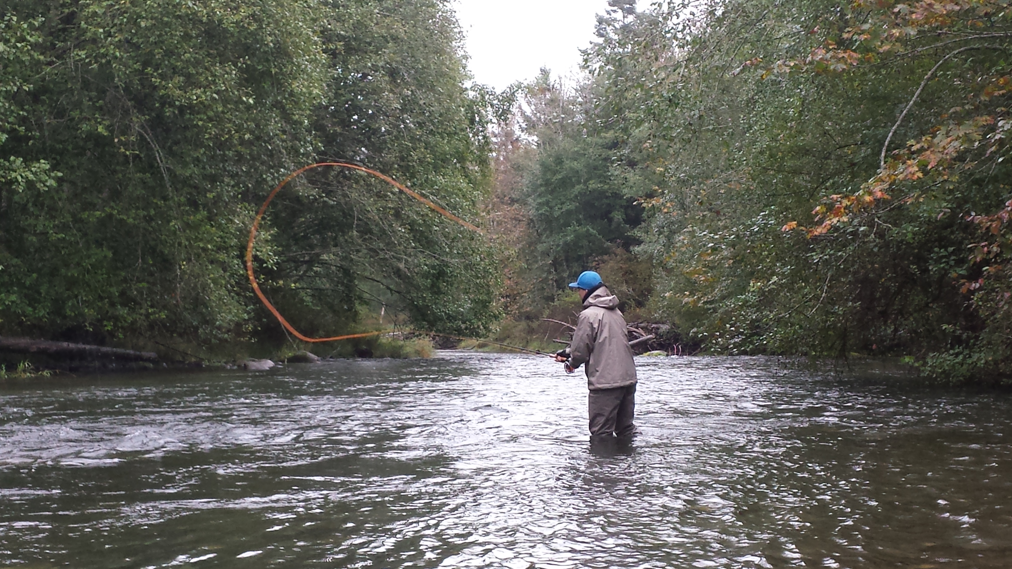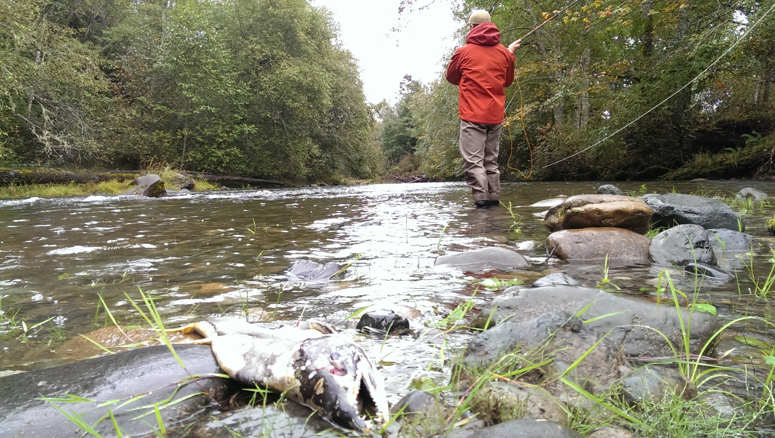 Heikillä oli kuitenkin unohtunut printattu kalastuslupa Suomeen, joten se piti päästä printtaamaan jossain. Printteriä emme helpolla löytäneet, joten lähimmän wifin kanssa nettiin ja PDF-muodossa kalakortti puhelimeen. Joelle päästyämme huomattiin, että kyttyrälohia on vieläkin sankoin joukoin joessa ja suurin osa niistä oli jo todella huonossa kunnossa. Myös rannat olivat täynnä raatoja. Aloitettiin kalastus erään kalankasvattamon yläpuolelta ja edettiin alas. Ensimmäisistä pooleista saatiin heti kaloja kiinni, mutta ei mitään ylös. Heikki nykäisi seuraavasta poolista nätin cutthroatin (punakurkkulohi), joka kuvauksen jälkeen jatkoi matkaansa.