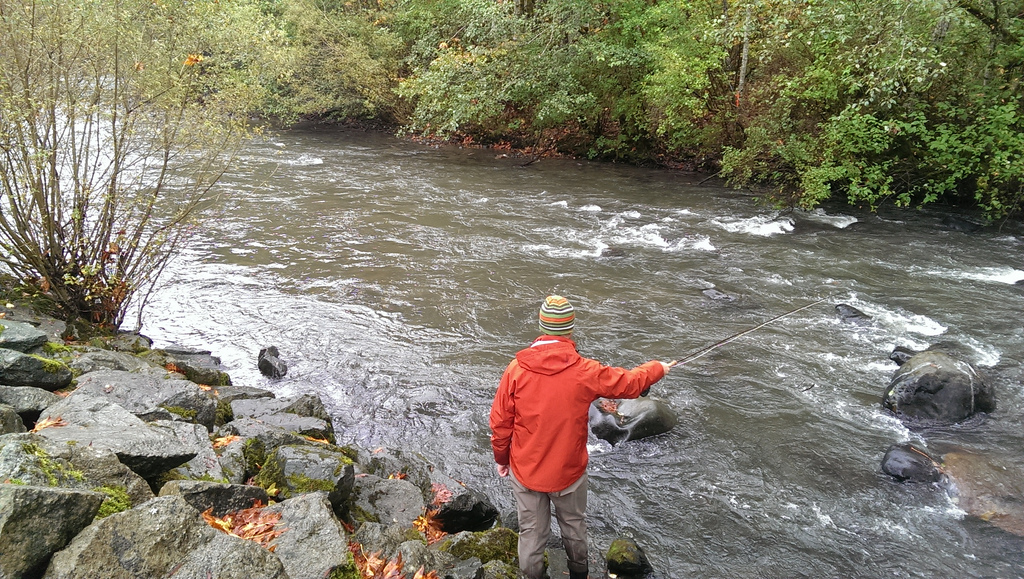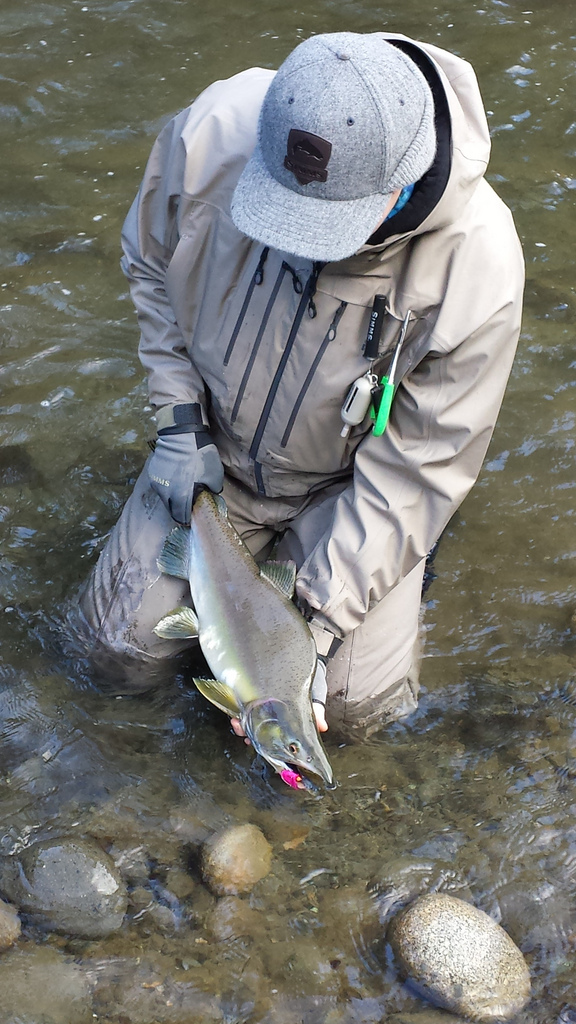 Eräs paikallinen onkimies kehotti kokeilemaan Hatcheryn yläpuolelta, sillä siellä olisi parempia paikkoja väsytyksen kannalta. Heti ensimmäisillä heitoilla Heikki tartutti pirtsakan kalan. Luulimme sitä alkuun steelheadiksi kyljessä vilkkuneen punertavan värin perusteella ja vapautimme kalan kiireellä analysoimatta sitä sen tarkemmin. Jälkeenpäin kuvasta huomattiin, että Cohohan se olikin. Valkoiset ikenet paljastivat tämän ei niin kirkkaan ja kauniin yksilön. Samasta poolista saimme mahtavia tärppejä cohoilta ja kalastus oli mutaisesta vedestä huolimatta hyvää ja tapahtumarikasta. Ainoastaan valtava määrä pinkkejä häiritsi touhua.