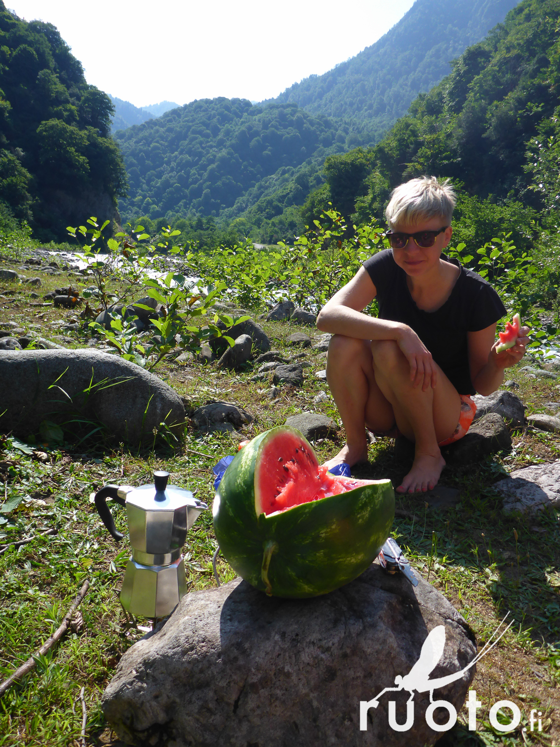 Vaikka en ole aamuihmisiä, seuraava aamu oli yksi upeimpia kokemuksia. Oli hieno kömpiä teltasta auringon paistaessa kirkkaalta taivaalta, vehreiden rinteiden välistä. Unelmien joki solisi vieressä ja tiedostin sen piilottelevan koloihinsa kalojen jalokiviä, nimittäin taimenia. Ennen varusteiden pukemista kuitenkin aamupalaksi sulgunia (Georgialainen juusto), leipää, maanviljelijältä ostettua jättiläismäistä vesimelonia ja muita mehukkaita hedelmiä sekä mutteripannulla keitettyä espressoa. Tällaisista aamuista ei osaa normaalisti edes unelmoida.
