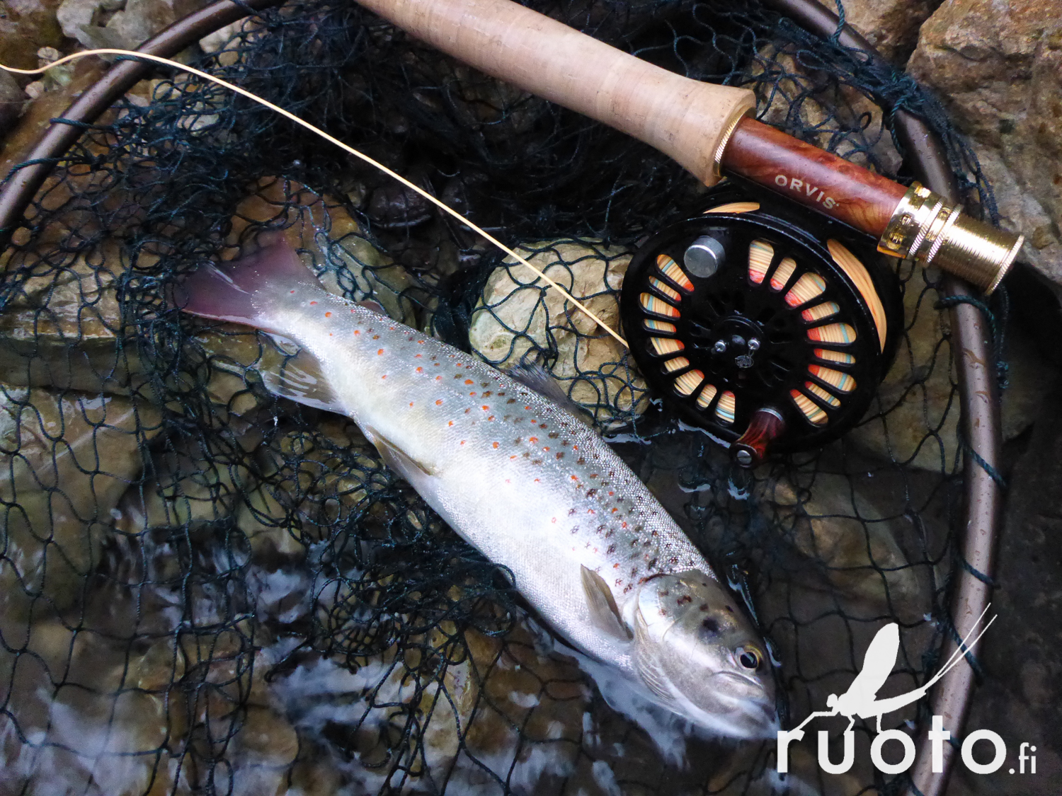 Kalastuksen ajattelin aloittaa kauniista poolista, joka sattui sijaitsemaan aivan telttapaikkamme vieressä. Jyrkkä ja kapea valkeakuohuinen koski laski hidasvirtaisempaan syvempään kohtaan, joka alapäästään mataloitui muodostaen lopulta kiihtyvän niskan ja jatkuen taas jyrkkänä koskena. Aloitin kalastuksen poolin alapäästä heittämällä kahta kuulapäistä nymffiä ylävirtaan, enkä montaakaan heittoa tarvinnut tehdä kun ensimmäinen pikkuruinen taimen hyväksyi oliivin nymffinin. Kun sain täydellisen kauniin taimenen käteeni, koin suurta onnistumisen tunnetta. Ajattelin että tämä on se kalastuksen suola. Pitkän pohjatyön tuloksena olin saanut taimenen upeasta joesta, jossa varmaankaan kukaan ei ole aikaisemmin kalastanut perholla.