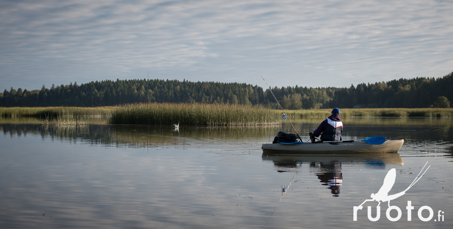 Sunnuntaina tuli onneksi pilvet ja keskipäivällä tuulikin alkoi yltymään. Kalat olivat huomattavasti lauantaita paremmalla purulla ja 6 kalamiehen voimin lähes 40 haukea kävi vapautettavana kajakkien ja kelluntarenkaiden vierellä. Suurimmat kalat olivat 5-6 kilon luokkaa ja yksi todellinen mörkökin päivän aikana karkuutettiin. Haukiperhot toimivat sunnuntainakin ylivoimaisesti parhaiten, lukuunottamatta päivän suurinta kalaa joka tuli Ukko Jerkin sinisellä Ruoto-värillä.