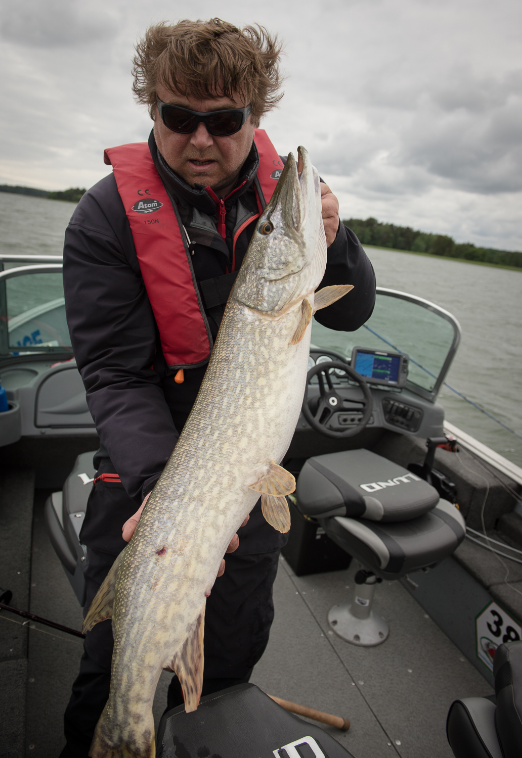 Tuttuun tyyliin ennen kuin olin edes saanut shadiä perukkeeni päähän kiinni, lensi Jannen reilu satagrammainen Snacky jo korkeassa kaaressa myötätuuleen. Jäin virittelemään myös Juuson vavan kuntoon opettaen hänelle samalla kumikalojen rigauksen saloja. Olisikohan ollut kolmas heitto, kun Janne jo repi vastaiskua. Hetken myöhemmin huuteli Janne jo haaviakin. Heitin vapani syrjään ja taitoin haavimme auki. Ekalla yrittämällä kala haavin pohjalle ja päälle Jannen tuuletukset. Nopeat yläfemmat ja kamera esiin. Illan ensimmäinen suurhauki oli veneessä!